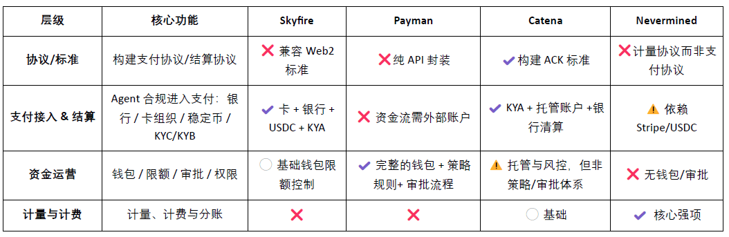 Skyfire, Payman, Catena Labs und Nevermined gehören zur Zahlungsabwicklungsschicht für Unternehmen und benötigen alle in unterschiedlichem Umfang Verbindungen zu Banken, Kartenorganisationen, Zahlungsdienstleistern und KYC/KYB-Systemen. Ihr eigentlicher Wert liegt jedoch nicht im „Zugriff auf Fiatgeld“, sondern in der Lösung von maschinennahen Anforderungen, die traditionelle Finanzdienstleistungen nicht abdecken können – Identitätszuordnung, Berechtigungsverwaltung, programmatische Risikokontrolle und nutzungsbasierte Abrechnung.