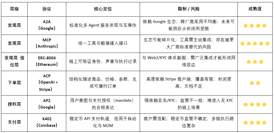 Ausgehend von der Einführung des Kernprotokollstapels von Agentic Commerce fasst die folgende Tabelle die Positionierung des Protokolls, seine Kernfunktionen, die wichtigsten Einschränkungen und die Reifegradbewertung auf jeder Ebene zusammen und bietet so eine klare, strukturierte Perspektive für den Aufbau einer plattformübergreifenden, ausführbaren und zahlbaren Agentenökonomie.