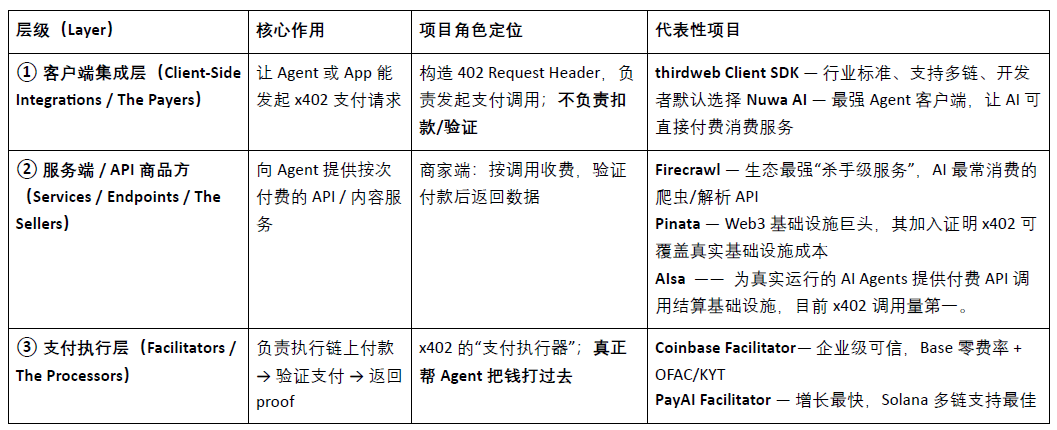 Zahlungsabwicklungsschicht (Vermittler/Prozessoren): Diese Schicht verarbeitet On-Chain-Abzüge, Verifizierung und Abrechnung. Sie ist die zentrale Ausführungs-Engine von x402. Zu den repräsentativen Projekten gehören: