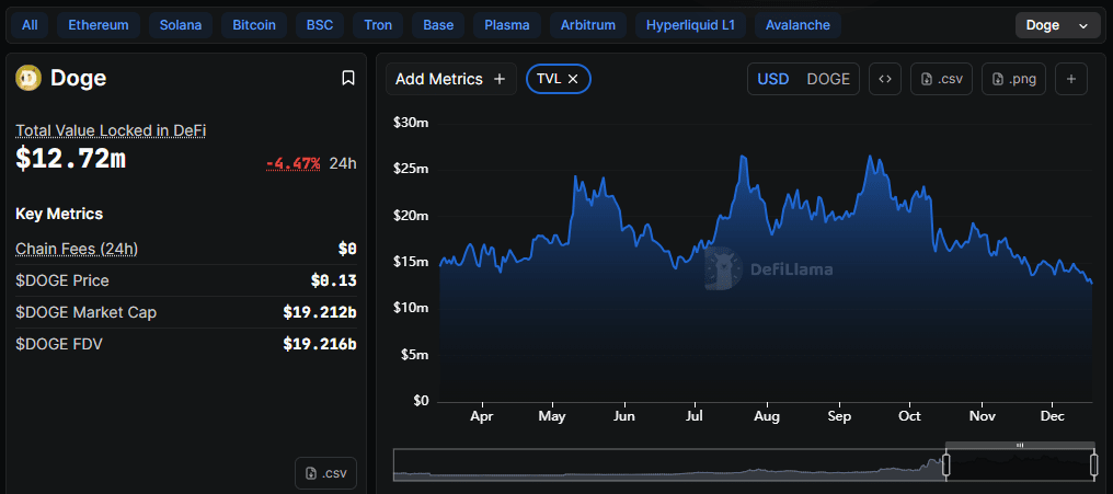 Ein Grund dafür könnte der Rückgang der Nutzung von Dogecoin im DeFi sein, da der TVL in DOGE-basierten Apps von 26 Millionen $ im September auf unter 13 Millionen $ gefallen ist.
