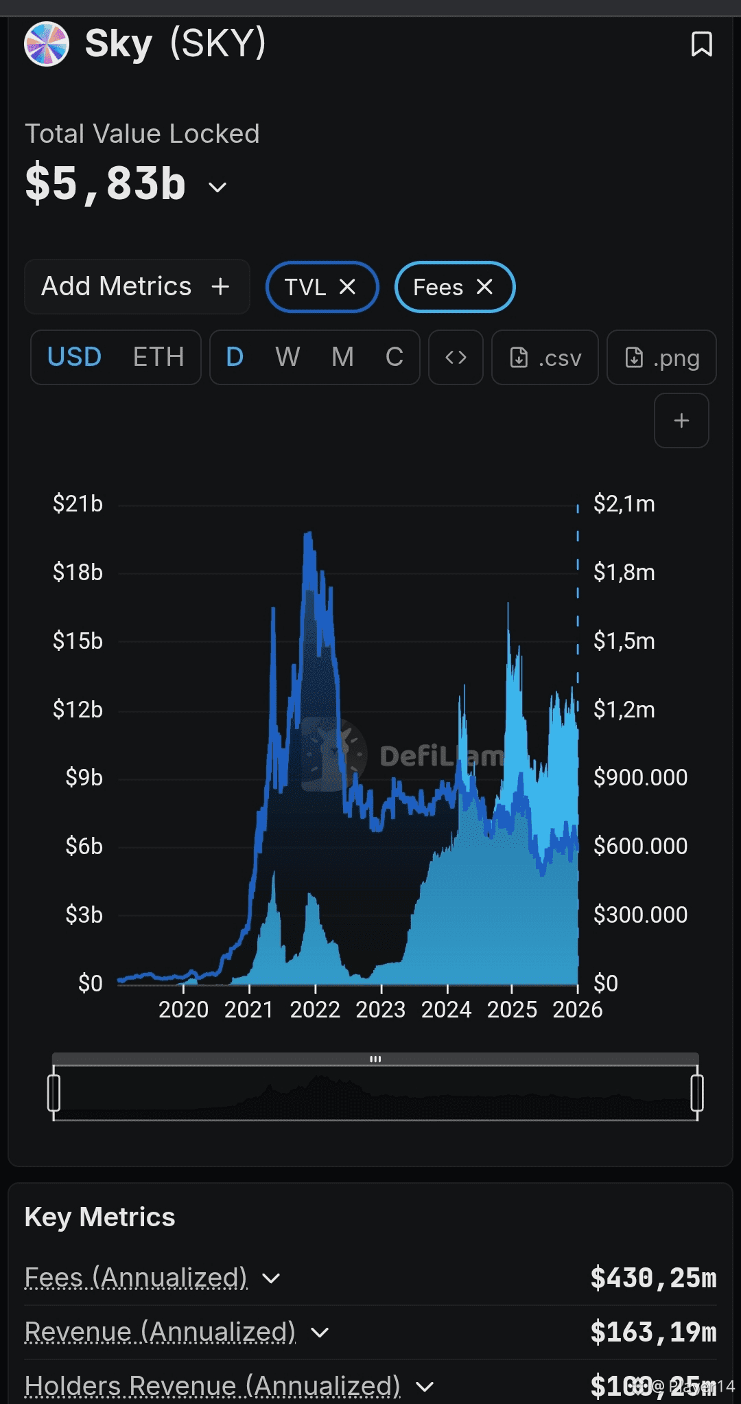 Vejam esse gráfico abaixo do token Sky (antiga Maker), um protocolo que mesmo com o mercado em baixa desde 2022 conseguiu manter $6 bilhões de TVL (Valor bloqueado) e boa parte desse capital é de boa qualidade por serem títulos do tesouro americano. Mas reparem algo muito mais interessante: As taxas. O protocolo Sky gera centenas de milhões de receitas reais e o excesso das receitas é usado para comprar tokens Sky e queima-los. Então não só existe receita real sendo gerada, como existe EXCESSO de receita. Isso basicamente é um modelo de gerenciamento feito pela Google e Apple com suas ações.