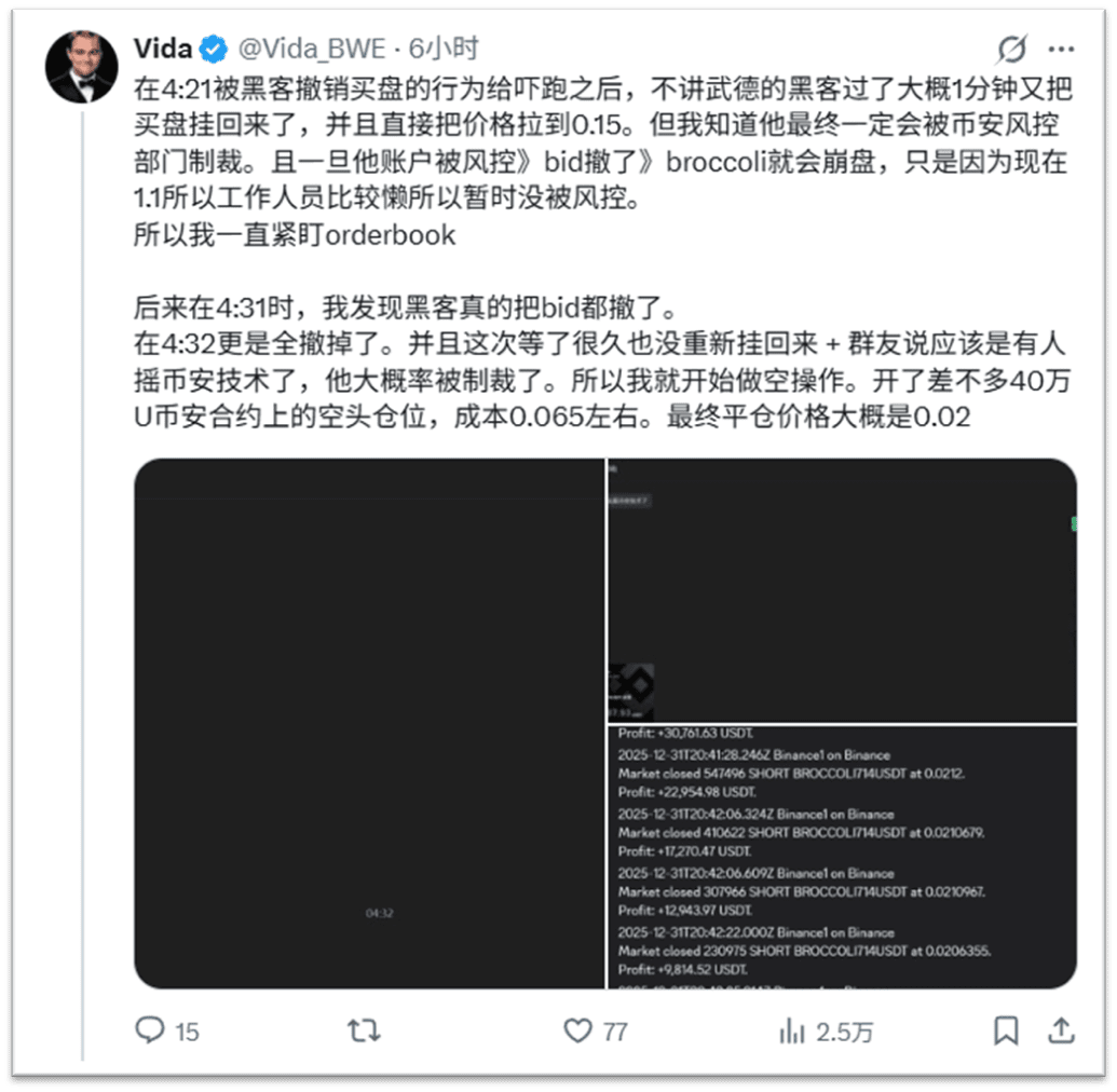Das Konto, das die verrückten Käufe tätigte, wurde auf Pause gedrückt. BROCCOLI714, dem die finanzielle Unterstützung fehlte, brach sofort zusammen. Zu diesem Zeitpunkt hatte Vida, der bereits Gewinne realisiert hatte, wieder Short gegangen und in dem Moment, als der Preis zusammenbrach, noch einmal kräftig zugegriffen und von 0,065 auf 0,02 verkauft.