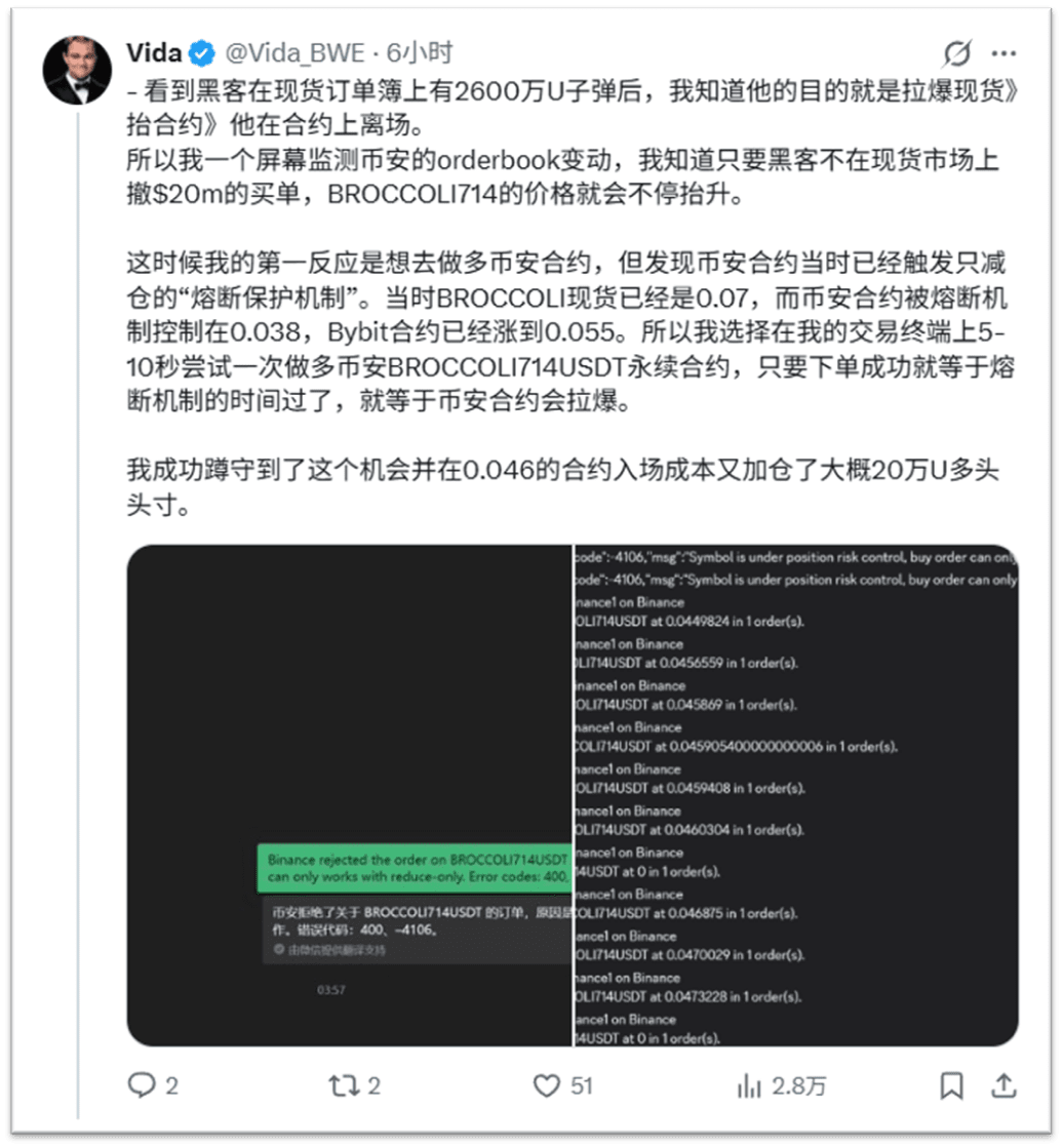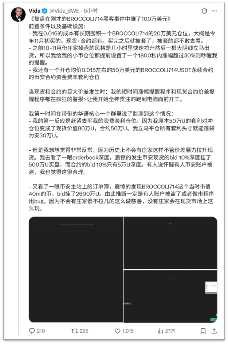 Vidas Computer gab um 0:00 Uhr einen ohrenbetäubenden Alarm von sich. Das war keine gewöhnliche Marktbenachrichtigung, sondern eine „Mine“, die er vor Monaten gelegt hatte, die jetzt explodierte: BROCCOLI714, das er zu einem Preis von 0,016 US-Dollar angehäuft hatte, stieg innerhalb kurzer Zeit um über 30% und war von großen Spot- und Kontraktpreisdifferenzen begleitet.