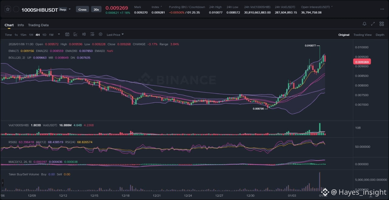 1000SHIB has been trading within a defined range over the past sessions, with price oscillating between local swing lows near 0.0028 and swing highs around 0.0032. The current structure points to a range-bound phase rather than a clear uptrend or downtrend, as evidenced by the flattening Exponential Moving Averages (EMAs) at 7, 25, and 99 periods. The 7 EMA sits just above price at approximately 0.00295, acting as immediate overhead resistance, while the 25 EMA around 0.0030 and the 99 EMA near 0.00295 provide a cluster of dynamic support. Bollinger Bands have contracted significantly, with the middle band aligning with the 25 EMA, indicating reduced volatility and a potential squeeze ahead. This setup suggests accumulation or distribution dynamics at play, where liquidity pockets are forming below the range low, awaiting a catalyst for expansion.