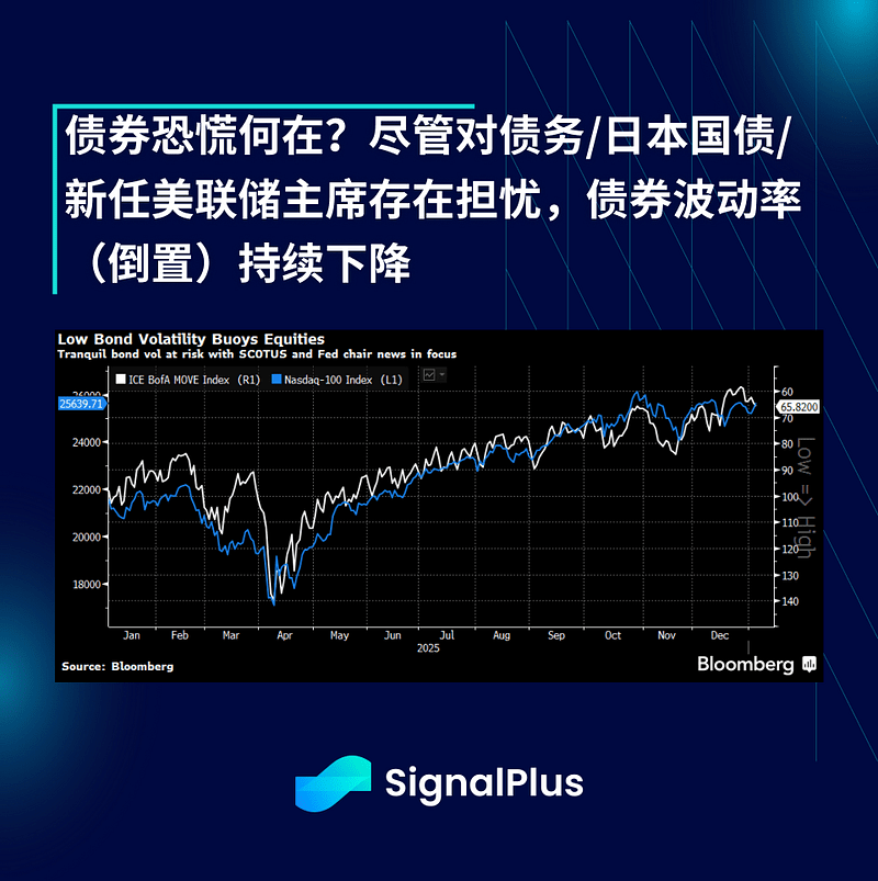 Zuletzt ist auch die Abnahme von Volatilität und Korrelation ein weiteres Signal. Mit der Verbesserung der Breite der Kursbewegungen bei Aktien sinkt die implizite Korrelation kontinuierlich, und die geringere makroökonomische Volatilität trägt nun dazu bei, die Kurse nach oben zu treiben. Trotz der ständigen apokalyptischen Aussagen über steigende ausstehende Schulden und steigende Renditen japanischer Staatsanleihen, erreichte die implizite Volatilität von festverzinslichen Anlagen Ende 2025 ein mehrjährige Tiefststand.