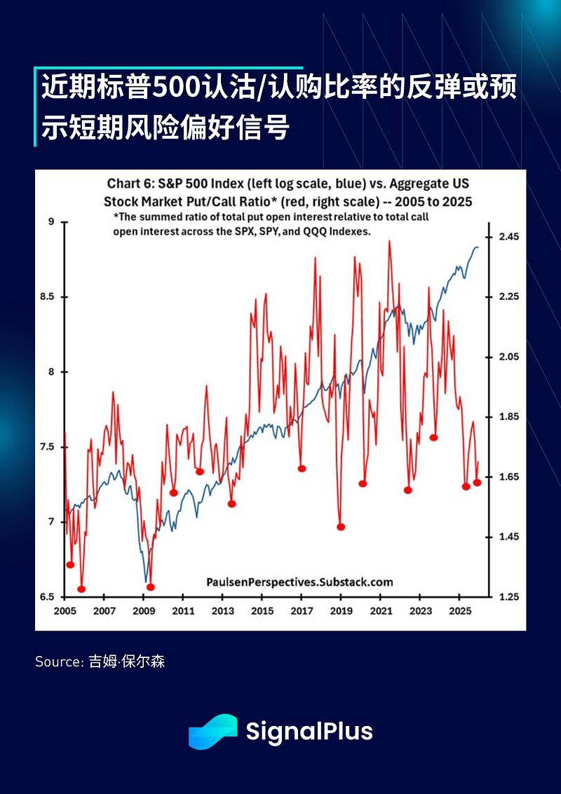 Zweitens, obwohl die Kapitalzuflüsse enorm sind, bleibt das Put-Call-Verhältnis des S&P 500-Index bei einem niedrigen Niveau, während der Index kontinuierlich neue Höchststände erreicht (was Vorsicht signalisiert). Historisch gesehen weist ein Anstieg dieses Verhältnisses (rote Punkte in der Grafik) oft auf eine starke Erhöhung der Risikobereitschaft am Markt hin, was wir bereits Ende letztes Jahres beobachten konnten. (Vollständig dank der Forschung von Jim Paulson)
