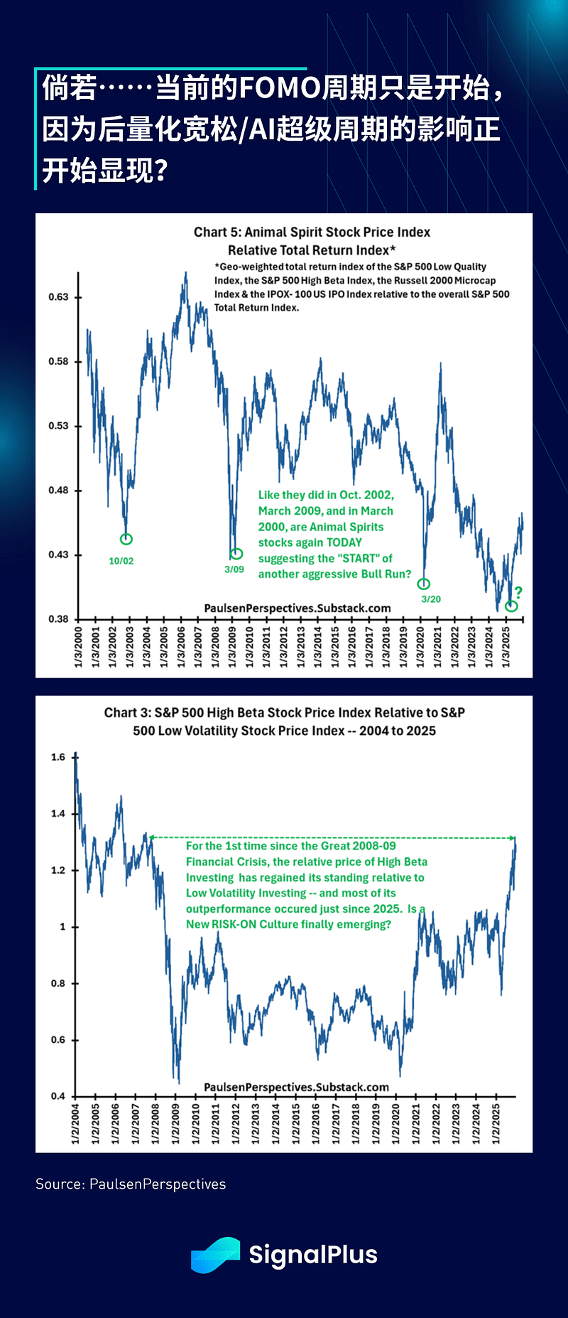 Drittens könnten wir möglicherweise eine signifikante Veränderung des animalischen Geistes beobachten. In letzter Zeit haben Aktien mit hohem Beta, niedriger Qualität, kleiner Marktkapitalisierung und Neuzulassungen starke Leistungen erbracht und tatsächlich wieder an Bedeutung und Überrenditen gewonnen. Langfristige Charts deuten darauf hin, dass wir möglicherweise eine strukturelle Aufwärtsbewegung sehen, die von FOMO (Furcht vor Verlust) und animalischem Geist getrieben wird – ist dies möglicherweise ein Ergebnis der langfristigen KI-Superzyklen und der Auswirkungen eines neuen Zeitalters der Handelsmacht?