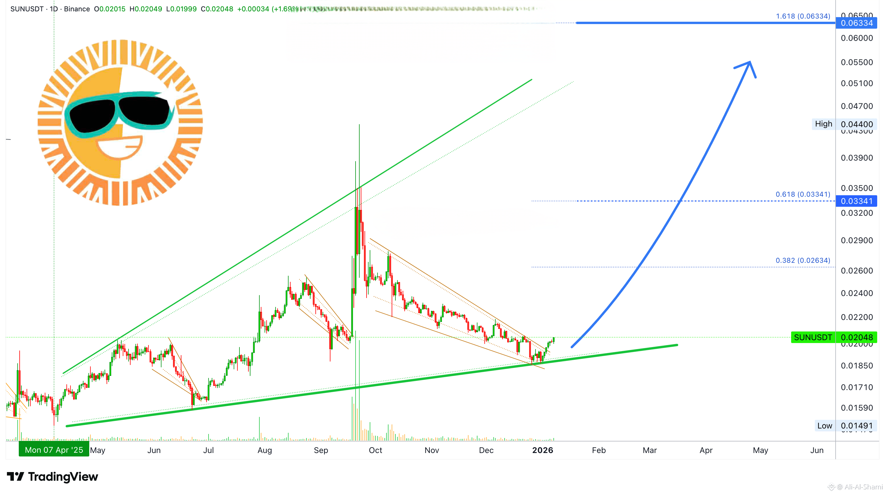 لقد استغرق الأمر وقتًا طويلاً للوصول إلى هذه المرحلة. استمرت تصحيحات عملة Sun لأكثر من ثلاثة أشهر؛ مع قناة صعودية متزايدة ومستويات منخفضة أعلى. هذا ترتيب رسم بياني مثالي وأعتقد أن تطورًا مثيرًا جدًا سيحدث قريبًا.