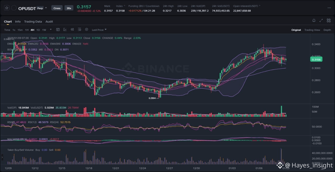 Delving into the price action, OP's structure reveals a range-bound consolidation following an impulsive upward move from late 2025 lows, now testing the upper boundaries of a symmetrical triangle pattern. The chart displays clear observable elements: a prolonged consolidation phase since mid-December, marked by lower volatility and contracting Bollinger Bands, suggesting an impending breakout attempt; rejection at local swing highs near 3.50, indicating seller resistance; and a recent bounce from the 2.90 support, forming a higher low that hints at accumulation rather than distribution. Employing exponential moving averages (EMAs), the 7-period EMA (currently sloping upward at 3.02) crosses above the 25-period EMA (2.98), signaling short-term bullish momentum, while both remain below the 99-period EMA (3.15), confirming the overarching downtrend from Q4 2025 peaks has paused but not fully reversed. Bollinger Bands, with the price hugging the middle band (20-period SMA at 3.04), underscore this range dynamic, where a volatility expansion could propel prices toward the upper band at 3.40.