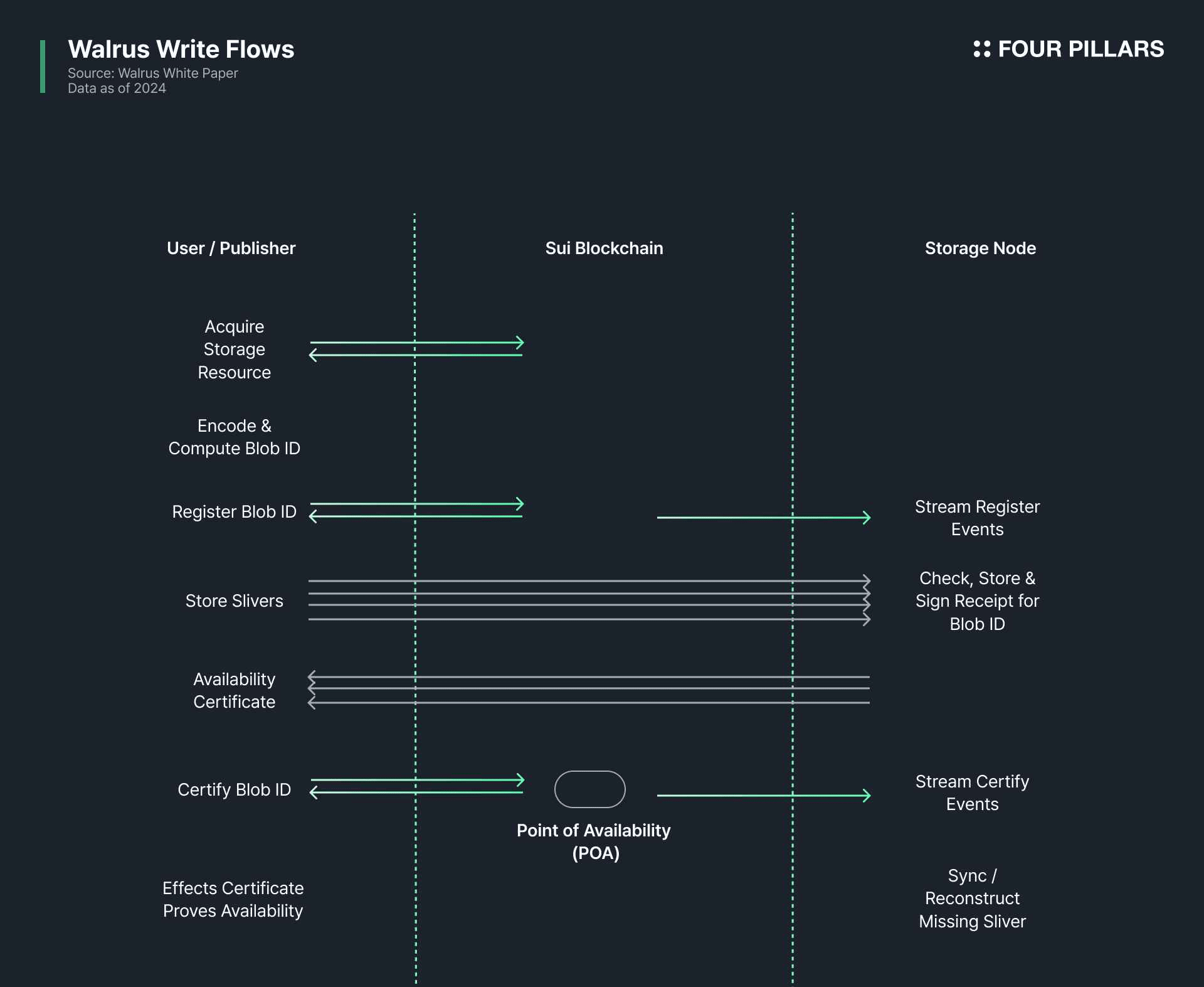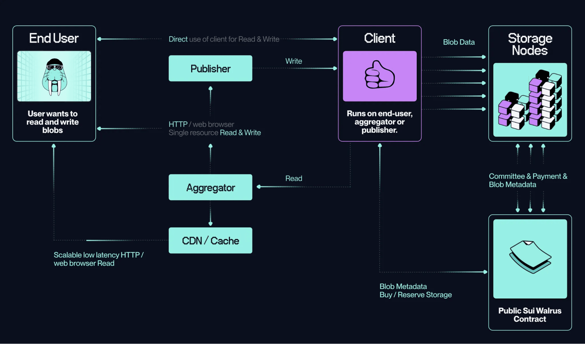 Ein definierendes technisches Merkmal von Walrus ist die Verwendung von Blob-Speicher in Kombination mit Fehlerkorrektur-Codierung. Große Dateien werden in mehrere Fragmente aufgeteilt, die mit Redundanz codiert und über viele Speicherknoten verteilt werden. Selbst wenn einige Knoten offline gehen oder ausfallen, kann die ursprüngliche Datei weiterhin rekonstruiert werden. Dieser Ansatz bietet starke Haltbarkeits- und Verfügbarkeitsgarantien, während er erheblich weniger Speicherüberhead als einfache Replikation verwendet, was die Kosten vorhersehbar und effizient hält.