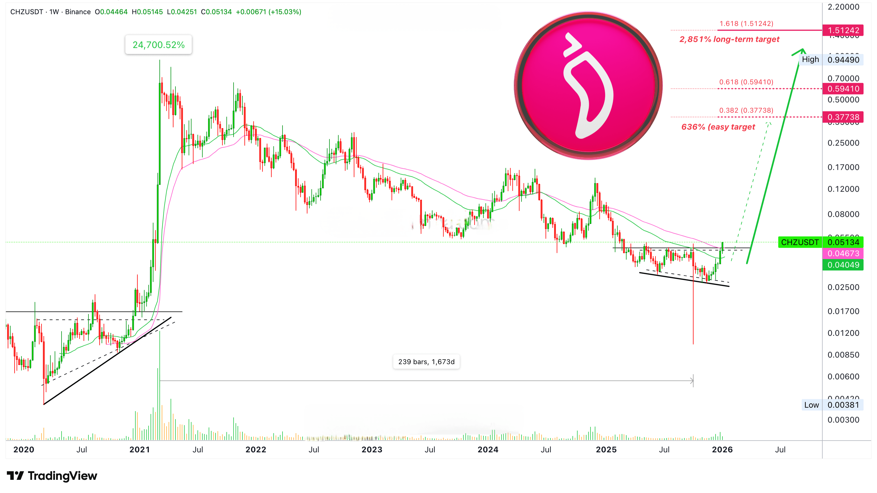 Zurück im Jahr 2020 erzeugte CHZUSDT ein Tief, das dem Oktober 2025 ähnelt. Danach folgte ein Mega-Bullenmarkt mit insgesamt 24.700 %. Ich bezweifle, dass wir eine derartige starke Steigerung sehen werden, aber es wird dennoch enorm werden, und die Signale sind bereits vollständig bestätigt.