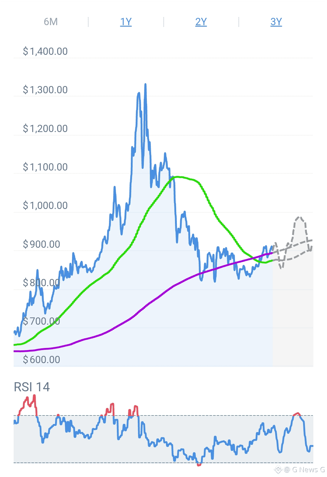 Current Price$ 907.63Price Prediction $ 914.47 (1.30%)Fear & Greed Index 29 (Fear)Sentiment BullishVolatility 2.57% (Medium)Green Days 16/30 (53%)50-Day SMA $ 873.10200-Day SMA $ 892.8414-Day RSI 58.50 (Neutral)