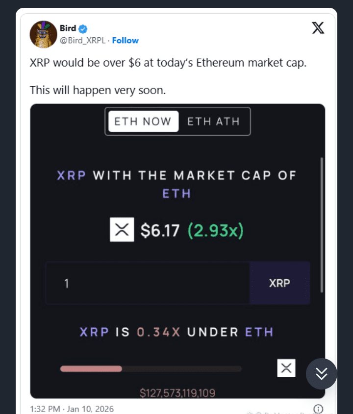 Ein kürzlich veröffentlichter Beitrag eines Krypto-Enthusiasten namens Bird bietet eine andere Perspektive auf die Bewertung von XRP – indem er es rein anhand der Marktkapitalisierung mit $ETH vergleicht, ohne kurzfristige Kursbewegungen oder Spekulationen zu berücksichtigen.