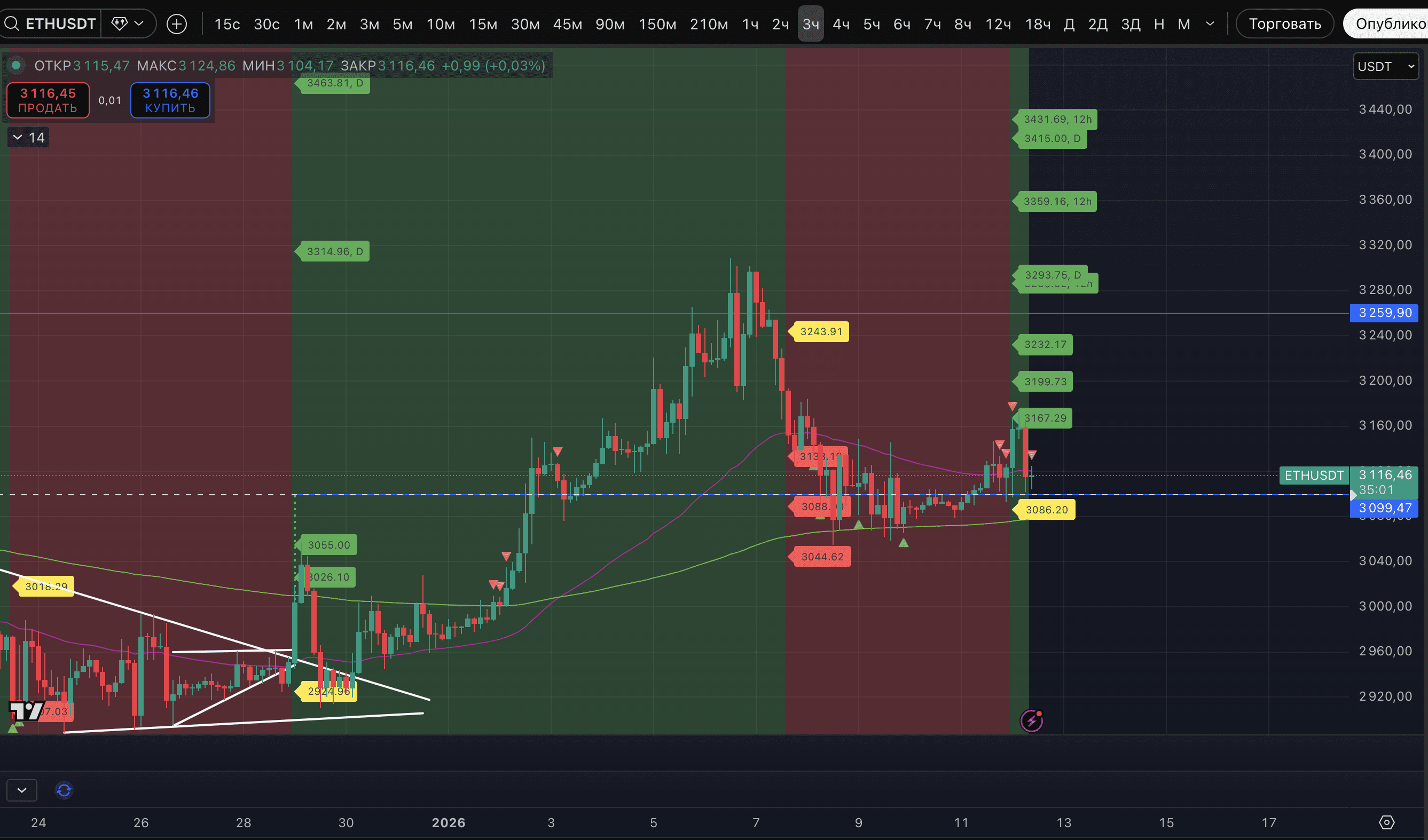 Seit dem morgendlichen Anstieg erhielt der Kryptomarkt eine nicht weniger farbenfrohe Aufnahme. Ein weiterer Pump und Dump. Obwohl der Umstand, dass ein bärisches Absorptionsmuster vorliegt, negativ ist, liegt der Schwerpunkt auf dem Trend. Und auf dem 3-Stunden-Chart, der für uns der Entscheidungszeitraum für spekulative Positionen ist, bleibt der Aufwärtstrend bei BTC und mehreren anderen Vermögenswerten erhalten.