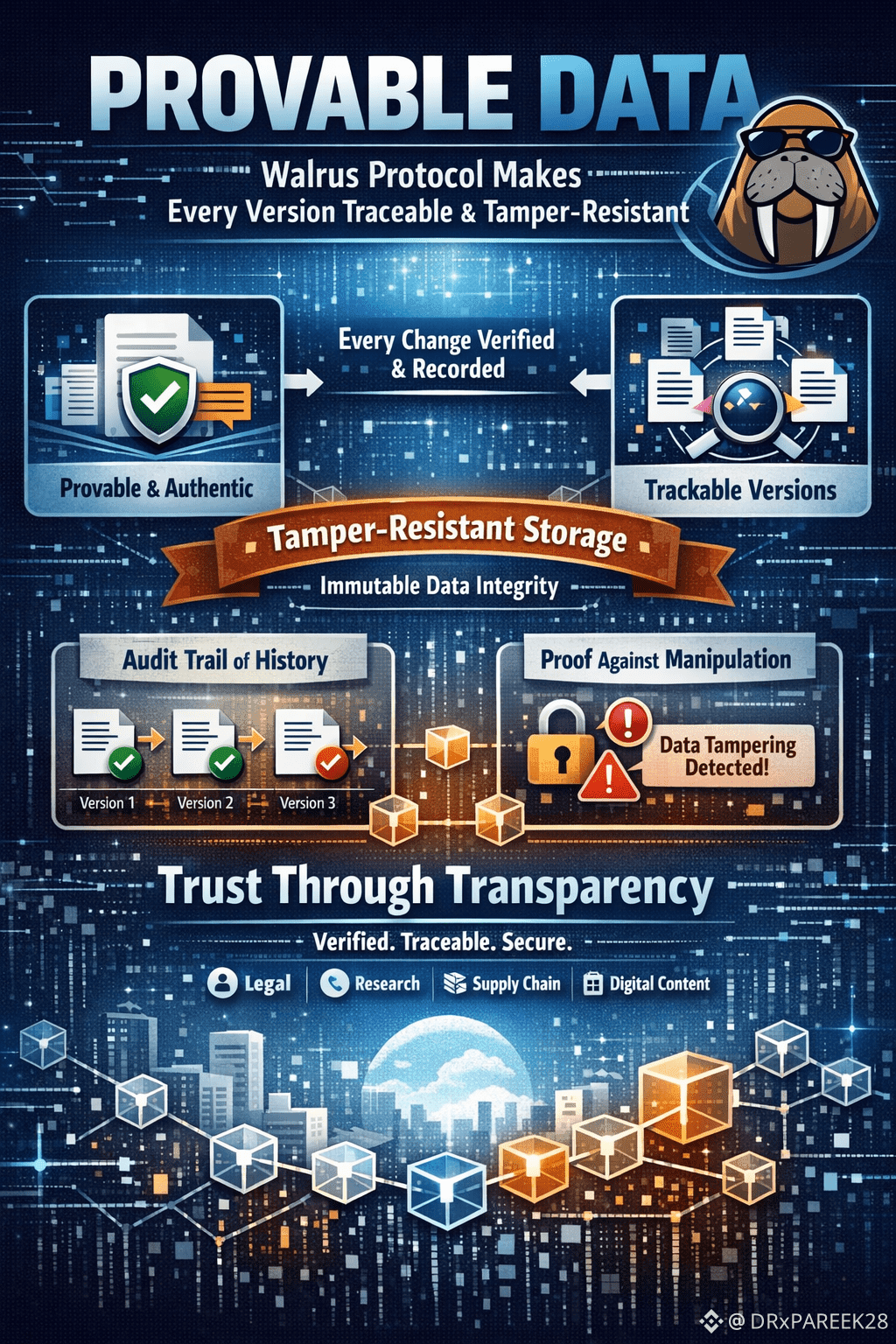In Web3, “storing data” is not enough anymore. The real challenge is proving that the data is authentic, unchanged, and truly belongs to the history it claims. Because once information moves across apps, chains, and users, trust becomes fragile. A single edited file, a replaced document, or a missing version can break the credibility of an entire system. That’s why the idea of provable data is becoming one of the most important foundations for the future internet — and this is exactly where Walrus Protocol shines.