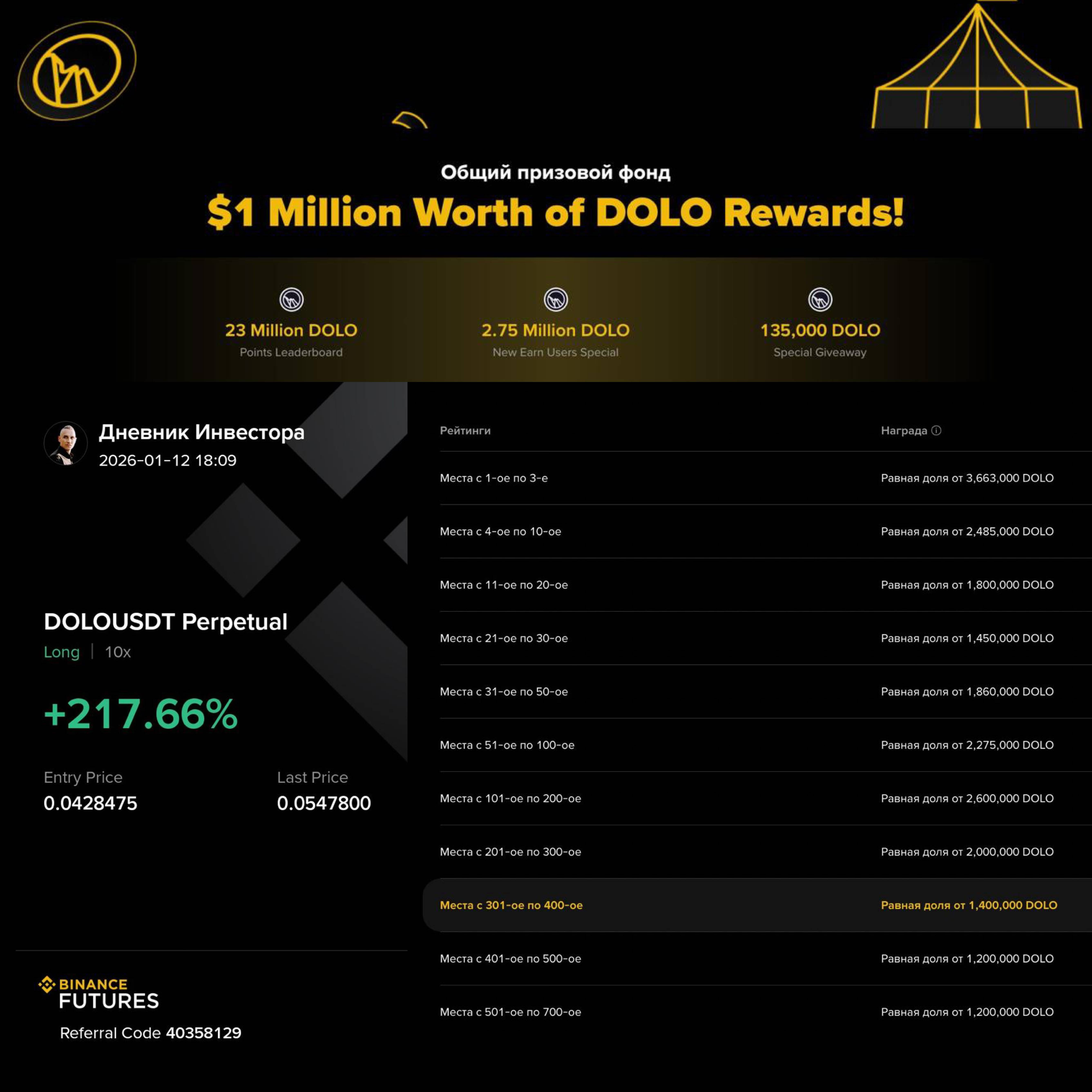 Ich bin auch in diese Top-1000 gekommen, aber ich fand es zu einfach, meine Belohnung von 14.000 DOLO sofort zu hedgen, und ich habe das Gegenteil getan – also habe ich einen Long-Position für das Asset ab 0,043 $ eröffnet. Angesichts der Tatsache, dass die Belohnungen bis zum 31. Januar vergeben werden können, gab es ausreichend Spielraum für die Market Maker.