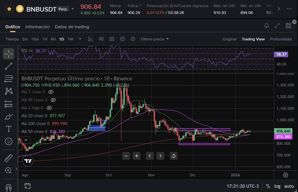 Wenn BNB den Support bei 899 USDT verliert und noch wichtiger, die Zone bei 876 USDT (wo sich die MA 50 und MA 20 täglich treffen), könnten wir eine schnelle Korrektur in Richtung der Nachfragebox bei 800–820 USDT sehen, um Liquidität zu suchen.