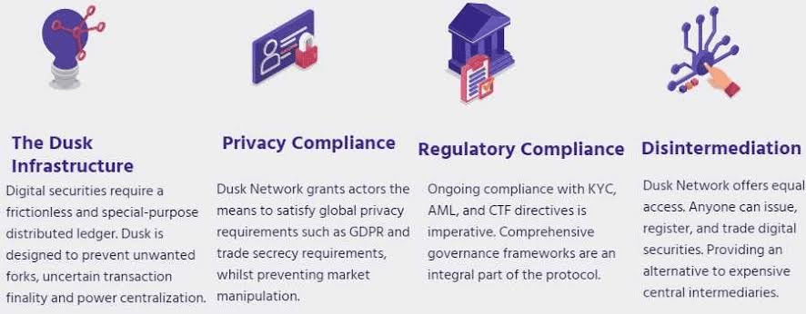 Anstatt Compliance und Privatsphäre später nachträglich einzubauen, ist Dusk von Grund auf darauf ausgelegt, regulierte Finanzanwendungen zu bedienen. Das oben abgebildete Bild veranschaulicht die Philosophie von Dusk anhand von vier Grundpfeilern, die ihre langfristige Relevanz definieren.