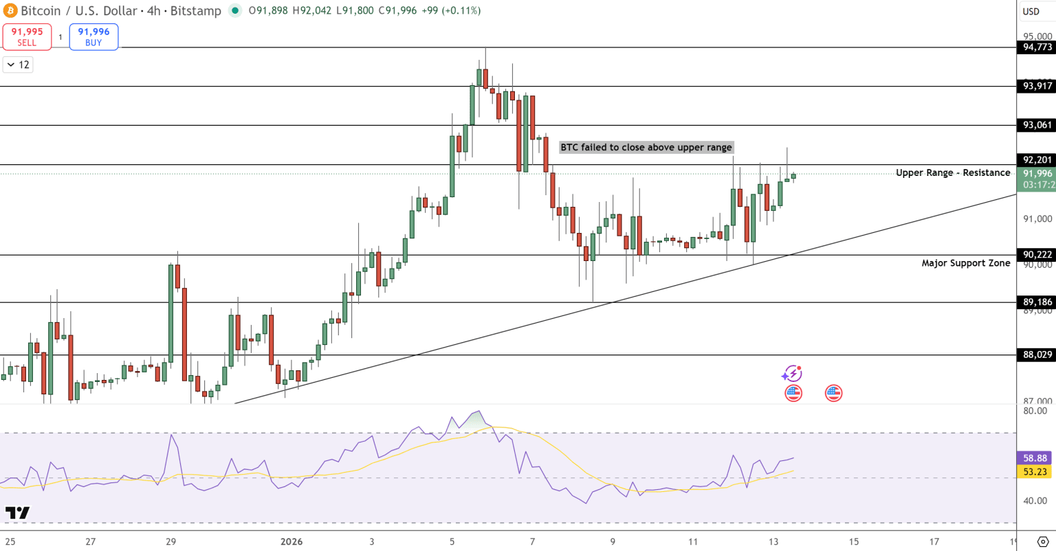 ¿Und unsere bevorzugte digitale Währung? Bitcoin hält sich wie ein Krieger nahe bei 92.000 US-Dollar. 🛡️ Obwohl er noch keinen explosiven Sprung vollzogen hat, ist seine Widerstandsfähigkeit es, was die ganze Welt zum Reden bringt. Er bewegt sich nicht mehr nur wie eine riskante Technologieaktie, sondern als echter Schutz vor dem Chaos der Regierungen. Technisch gesehen sieht das Bild solide aus: Wenn BTC den Support bei 90.200 US-Dollar hält, sehen die Analysten eine klare Route nach 95.000 US-Dollar oder sogar darüber. Der RSI (ein Indikator, der die Stärke der Bewegung misst) befindet sich bei einem optimalen Wert von 55, was bedeutet, dass noch Platz für weitere Aufwärtsbewegungen besteht, ohne dass der Markt als "überhitzt" empfunden wird. 📈