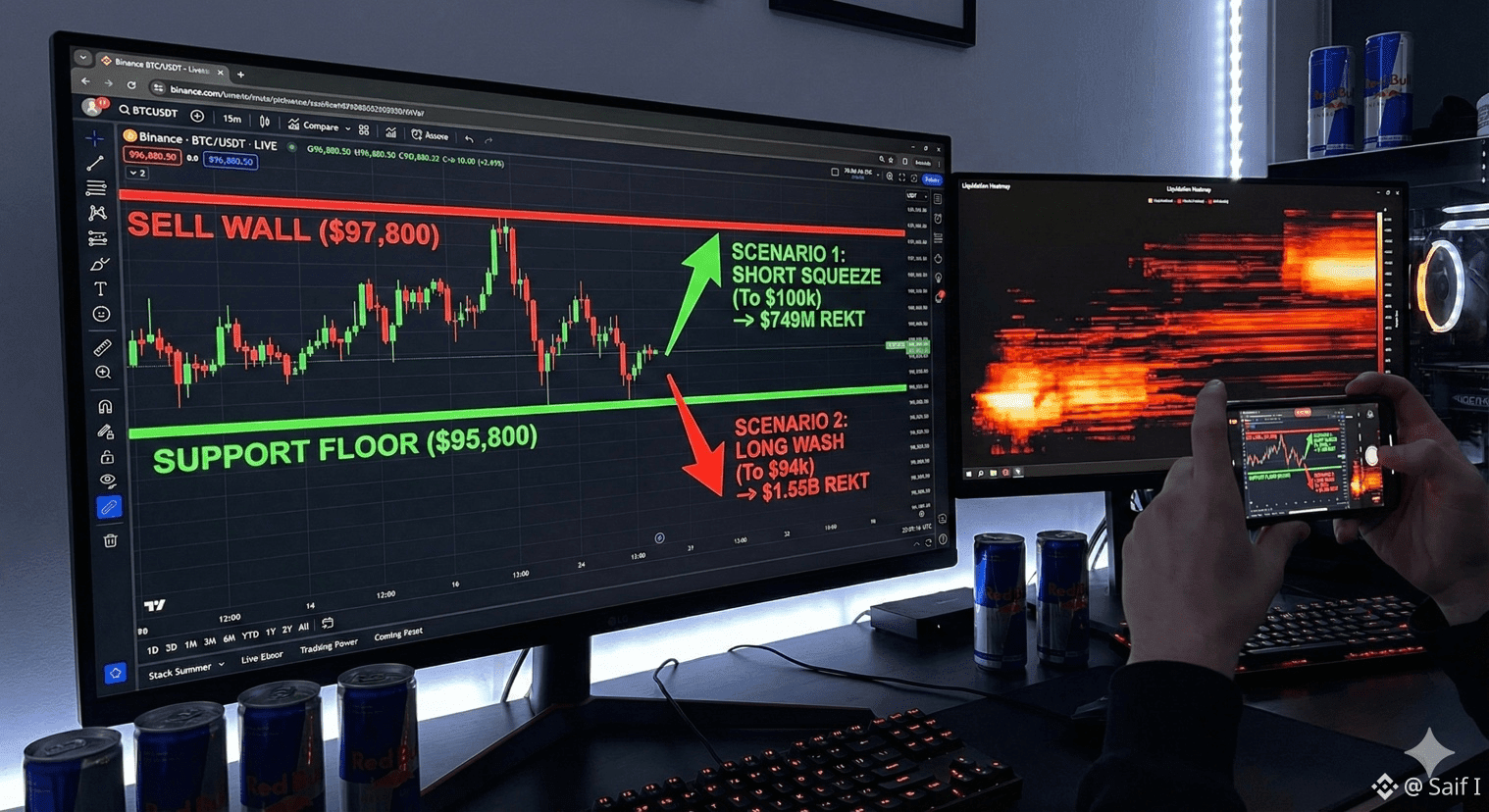 The "Long Wash" (To the Downside): Below $95,800, there is a "Liquidity Gap." If the price breaks this support, it could cascade down to $94,000 almost instantly to hit the $1.55 billion in long liquidations.