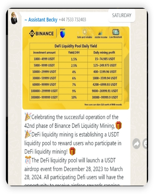 Nachdem das Vertrauen aufgebaut wurde, verlagert sich dies auf Gespräche über Websites von Drittanbietern, die äußerst gute Renditen versprechen.