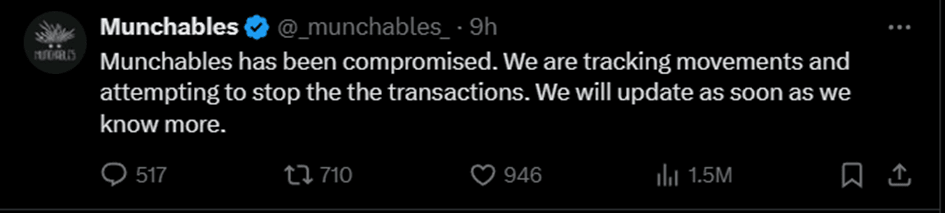 Munchables begann zusammen mit Blockchain-Experten wie PeckShield und ZachXBT sofort, den Fluss der gestohlenen Gelder zu verfolgen, um sie zurückzuerlangen.