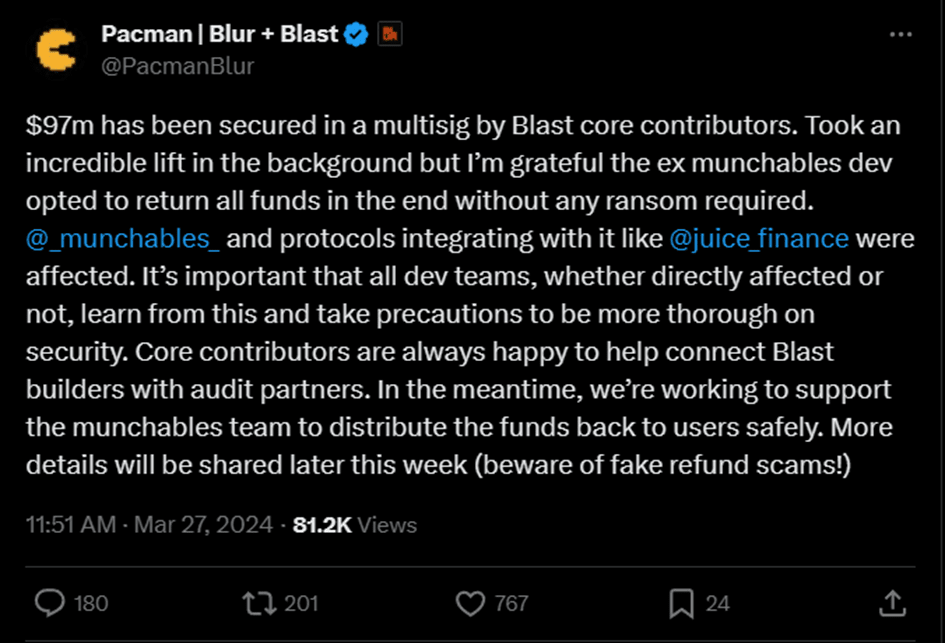 Da Munchables auf der Blast-Blockchain erstellt wurde, plant Pacman eine Zusammenarbeit mit dem Munchables-Team, um bei der Umverteilung der nun zurückgegebenen gestohlenen Gelder zu helfen.