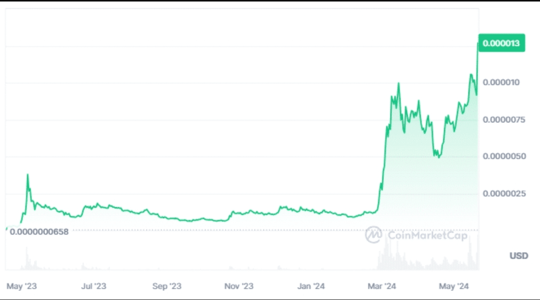 🌿 PEPE hat Geschichte geschrieben, nachdem es innerhalb von zwei Monaten mehrere Allzeithochs aufgestellt hat. Es war aufgrund seines enormen Gewinnpotenzials im Portfolio jedes Anlegers, da der Token viele lukrative Möglichkeiten bot und seinen Anlegern das Hundertfache an Gewinn einbrachte. Der PEPE-Preis liegt bei 0,00001222 $, nachdem er vor zwei Stunden einen neuen Allzeithochrekord von 0,00001274 $ aufgestellt hatte.