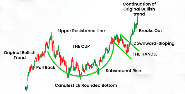 Das Tassen- und Henkelmuster ist ein technischer Analyseindikator, der eine Fortsetzung des Aufwärtstrends signalisiert. Dieses Muster besteht aus zwei Teilen: einer „Tasse“, die einem abgerundeten Boden ähnelt, und einem „Henkel“, der vor einem Aufwärtsausbruch eine leichte Abwärtsbewegung bildet. Die Bildung dieses Musters geht typischerweise erheblichen Aufwärtspreisbewegungen voraus, da es eine Konsolidierungsphase darstellt, auf die erneutes Kaufinteresse folgt.
