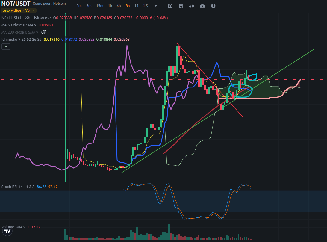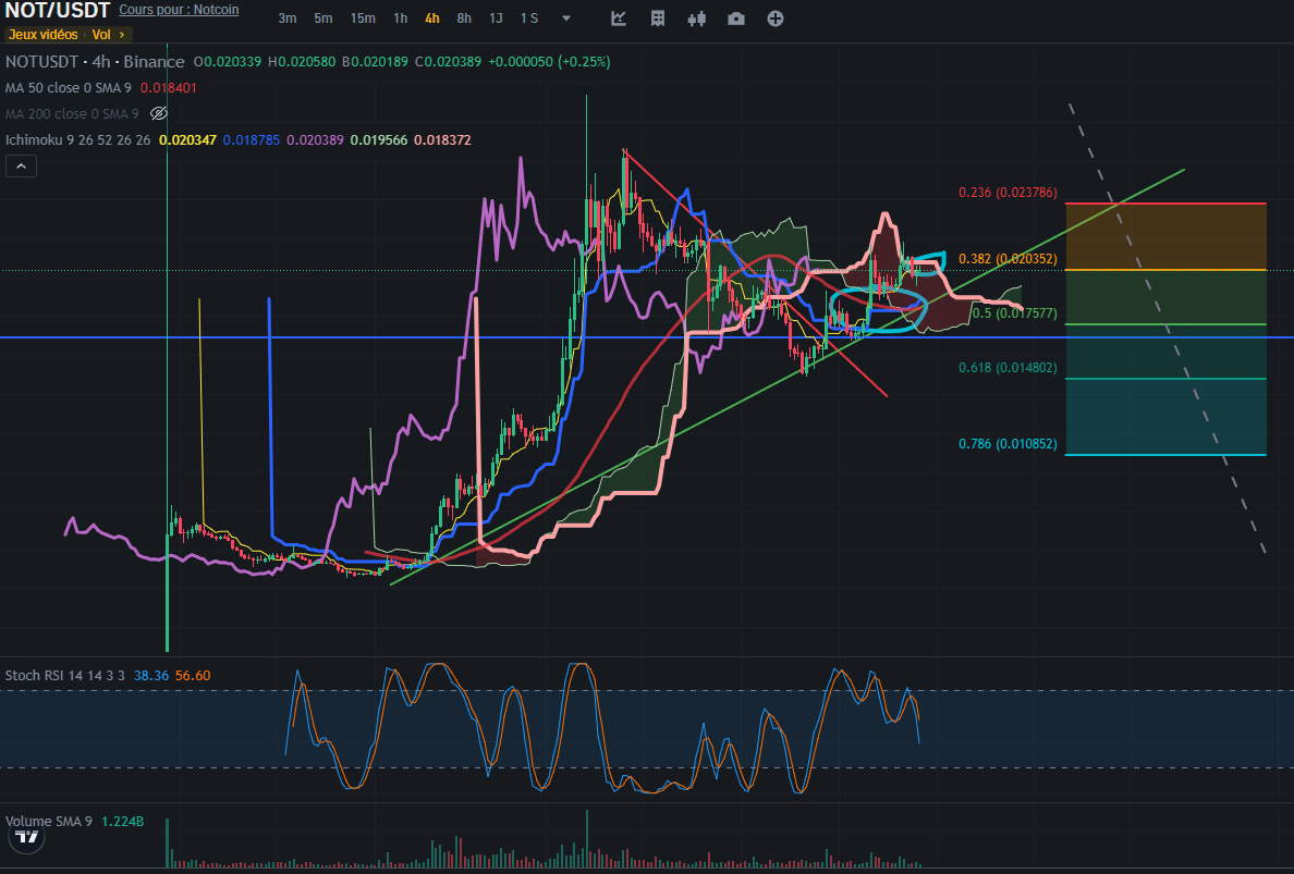 NotCoin befindet sich an einem kritischen Punkt. Das 0,5 Fibonacci-Retracement-Level ist derzeit eine wichtige Unterstützung, und der Token strebt einen Durchbruch durch das 0,382 Fibonacci-Retracement-Level und den SSB bei 0,020377 an. Die Ichimoku-Cloud-Analyse deutet auf Unentschlossenheit hin, mit der Möglichkeit einer bullischen Umkehr, wenn die Preise über die Wolke steigen. Aufgrund der aktuellen Widerstandsniveaus und der geringen Handelsvolumina ist jedoch Vorsicht geboten. Die genaue Überwachung dieser Schlüsselniveaus wird für die Bestimmung der nächsten Preisbewegungen von entscheidender Bedeutung sein.