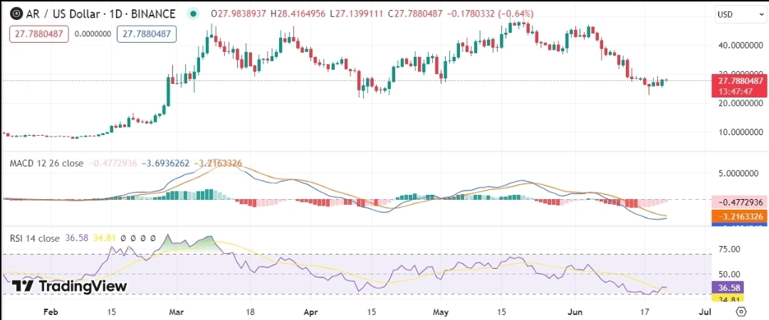 🔹Arweave (AR) hat heute eine robuste Leistung gezeigt und ist um 8,28 % auf 27,57 $ gestiegen. Das Tagesdiagramm zeigt, dass AR sich in einer Erholungsphase befindet, nachdem es in früheren Sitzungen einem Abwärtsdruck ausgesetzt war. Der MACD-Indikator liegt immer noch unter der Signallinie, was darauf hindeutet, dass die bullische Dynamik an Fahrt gewinnen könnte. Der RSI bei 36,11 deutet jedoch darauf hin, dass sich die Münze immer noch im überverkauften Bereich befindet, was eine Kaufgelegenheit für Anleger bietet, die auf eine mögliche Erholung warten.