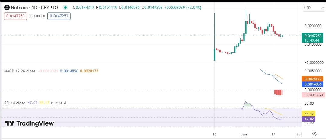 🔹Notcoin (NOT) verzeichnete einen bemerkenswerten Anstieg von 6,48 % und erreichte 0,01537 $. Das Tagesdiagramm der Münze zeigt ein ähnliches Muster wie AR und JASMY, wobei der MACD einen Aufwärtstrend anzeigt und der RSI bei 47,17 auf eine neutrale bis leicht bullische Marktlage hindeutet. Diese Kombination von Indikatoren deutet auf eine mögliche Aufwärtsentwicklung hin, wenn die Marktbedingungen günstig bleiben.