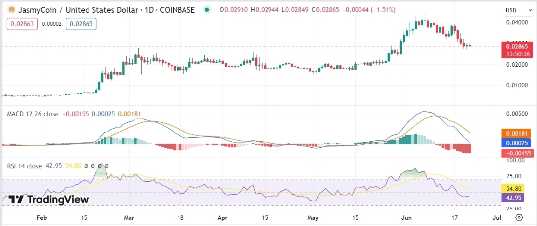 🔹JasmyCoin (JASMY) verzeichnete ebenfalls deutliche Zuwächse, nämlich einen Anstieg um 5,16 % auf 0,03263 $. Das technische Diagramm zeigt, dass JASMY in einem engen Bereich gehandelt wird, wobei der MACD einen leichten bullischen Crossover zeigt und der RSI bei 43,07 eine neutrale Marktposition anzeigt. Diese Konstellation deutet auf Potenzial für weitere Gewinne hin, wenn die Münze den aktuellen Widerstand durchbricht.