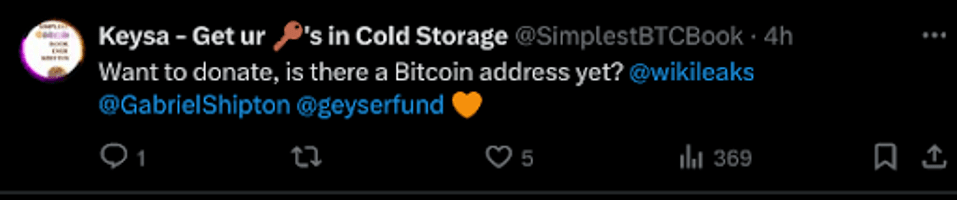 Es ist nicht verwunderlich, dass es eine neue Möglichkeit gibt, mit Bitcoin Geld zu spenden, da Julian Assange und seine Familie schon seit langem ein Teil von Bitcoin sind. Julian sprach mit Satoshi über die Annahme von Bitcoin-Spenden an Wikileaks. Das war die Gelegenheit, als PayPal die für Wikileaks bestimmten Gelder einfror. Julian hat auch über seine tiefe Leidenschaft und das Schreiben über Bitcoin gesprochen, beispielsweise in einem Reddit-AMA, in dem er schrieb: „In meinem Buch steht viel über Bitcoin – über meine Gedanken dazu und die Geschichte von WikiLeaks damit.“ Eric Schmidt und ich haben eine Weile darüber gesprochen und ich habe auch viele Notizen beigefügt, um meine Ansichten zu vertiefen. Es ist ein faszinierendes und komplexes Thema, deshalb kann ich nicht alles behandeln.“ Julian behauptete außerdem, im Jahr 2017 einen Gewinn von 50.000 % mit Bitcoin erzielt zu haben. Seitdem befindet sich der Preis von Bitcoin im Jahr 2017 im Aufwärtstrend (ca. 1.000 USD). bisher ca. 60 Mal (ca. 60.000 USD).