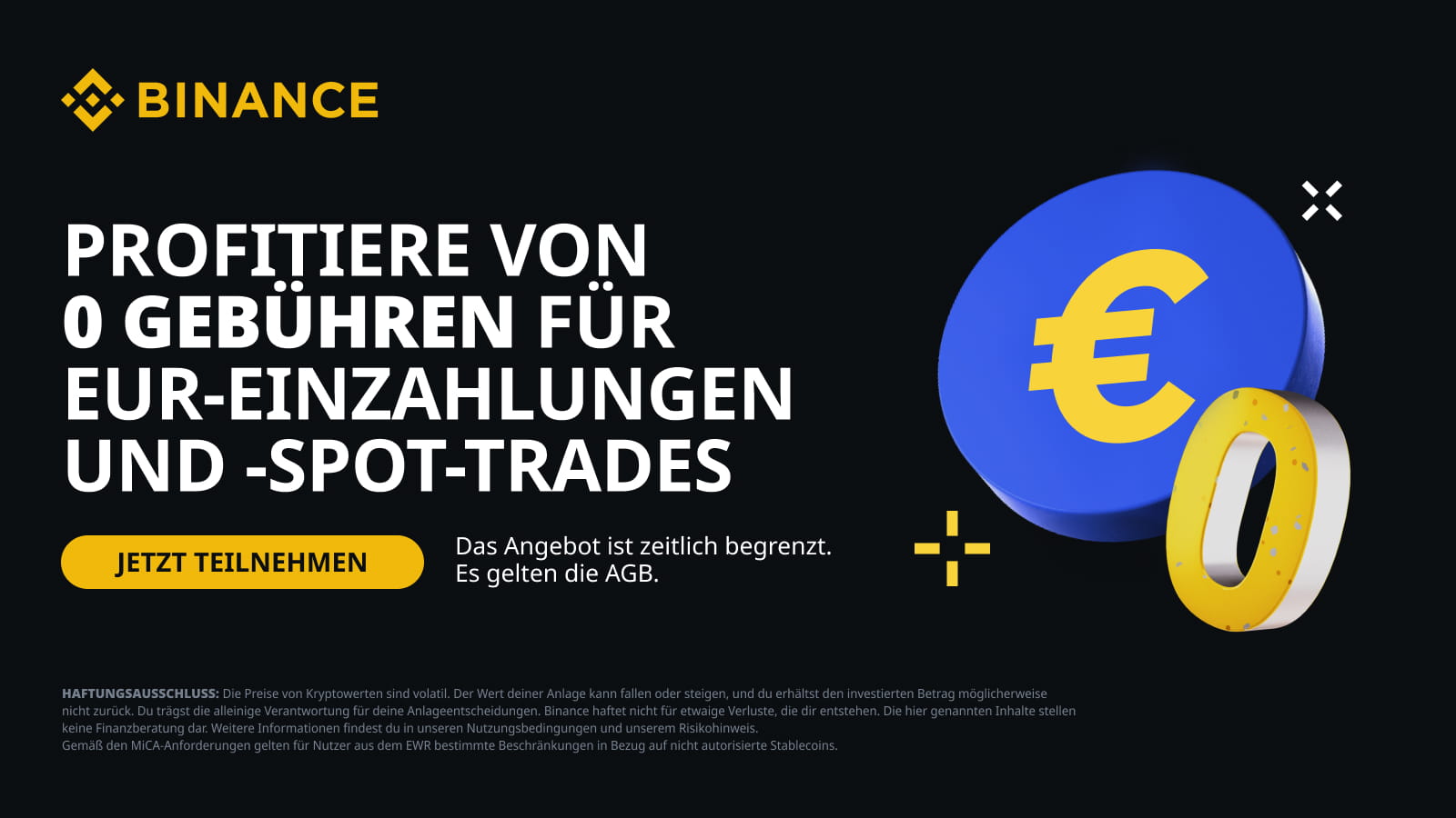 Berechtigte Nutzer können während des Aktionszeitraums ihre erste EUR-Einzahlung gebührenfrei vornehmen (begrenztes Angebot).