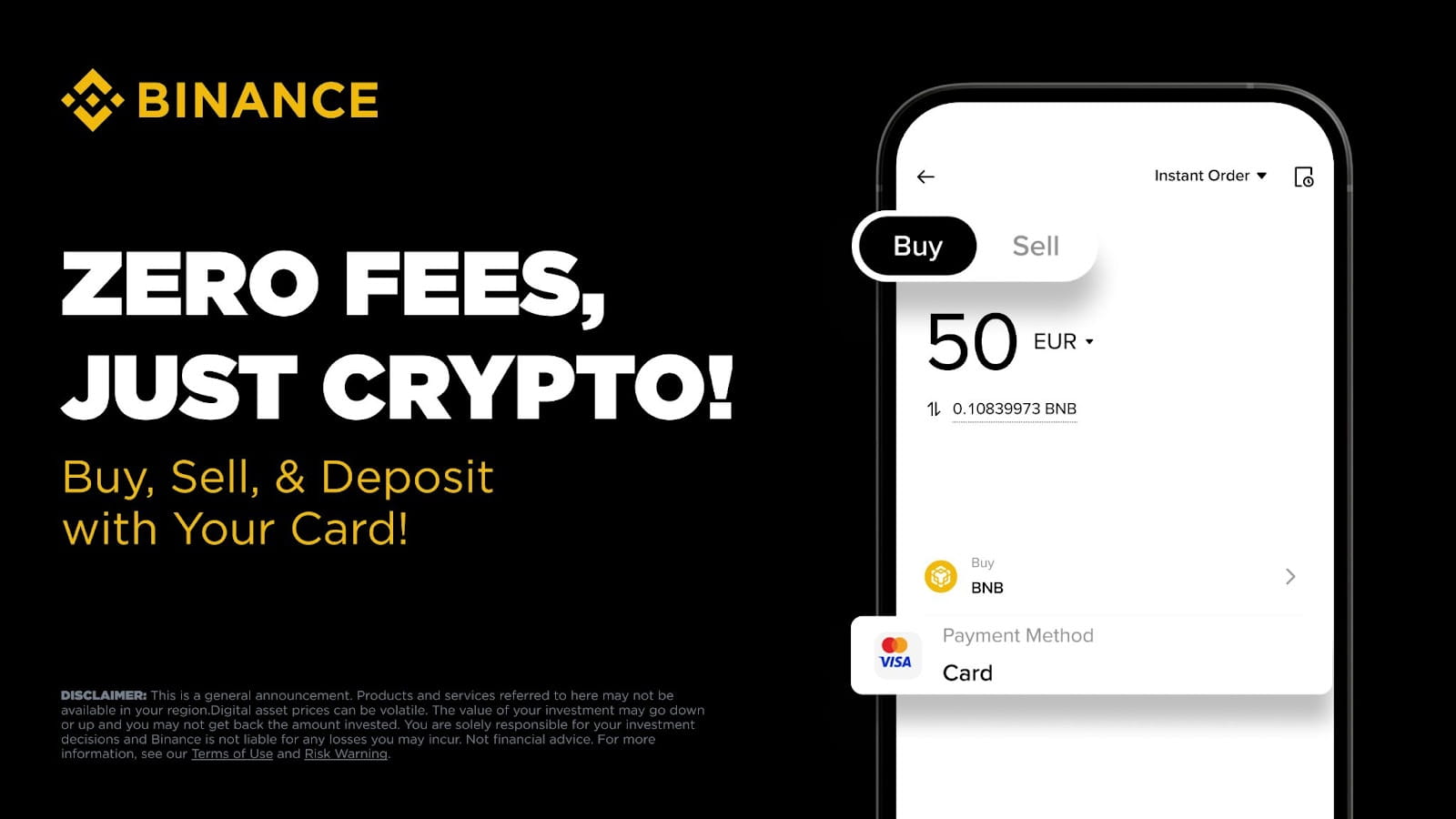 Binance is launching a limited-time promotion! During the Promotion Period, all eligible users can now buy crypto with local currency or deposit EUR with zero fees using card, Apple Pay, or Google Pay. Users can also sell crypto to Fiat and withdraw to cards with zero fees.