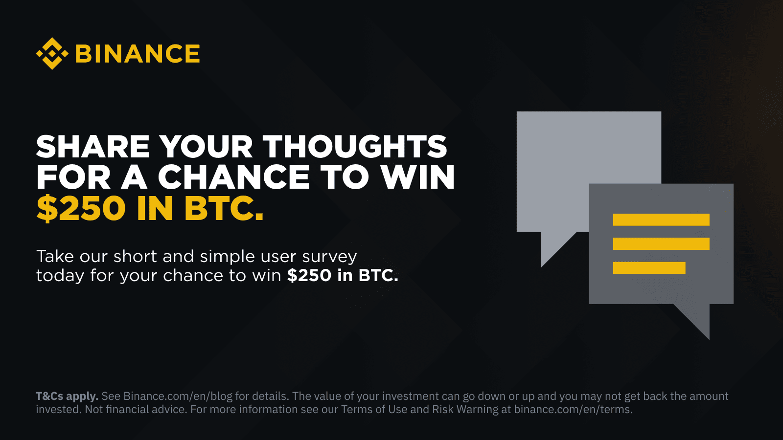 We are always user-first, and we want to hear from our users! Answer these quick questions for a chance to win AUD$250 in BTC deposited directly to your Binance account. Let us know what you think about Binance, why you chose us and what’s most important to you.