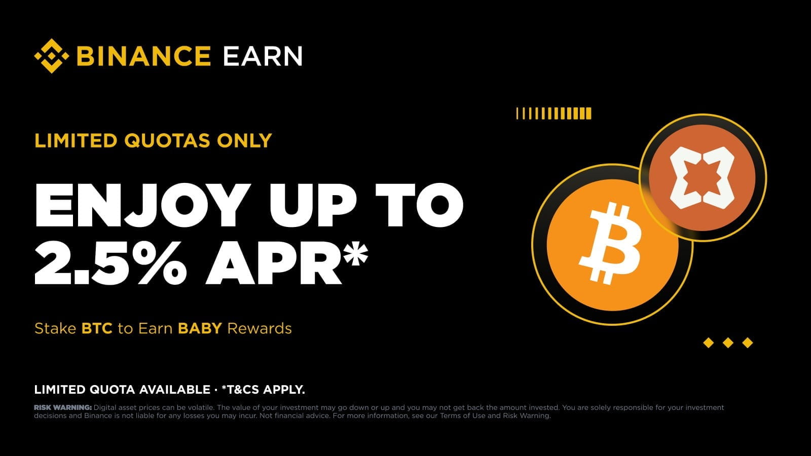 Binance On-Chain Yields is pleased to announce a BTC Staking on-chain with rewards in Babylon (BABY). Stake BTC during the Staking Period to get up to 2.5% in APR rewards in BABY!