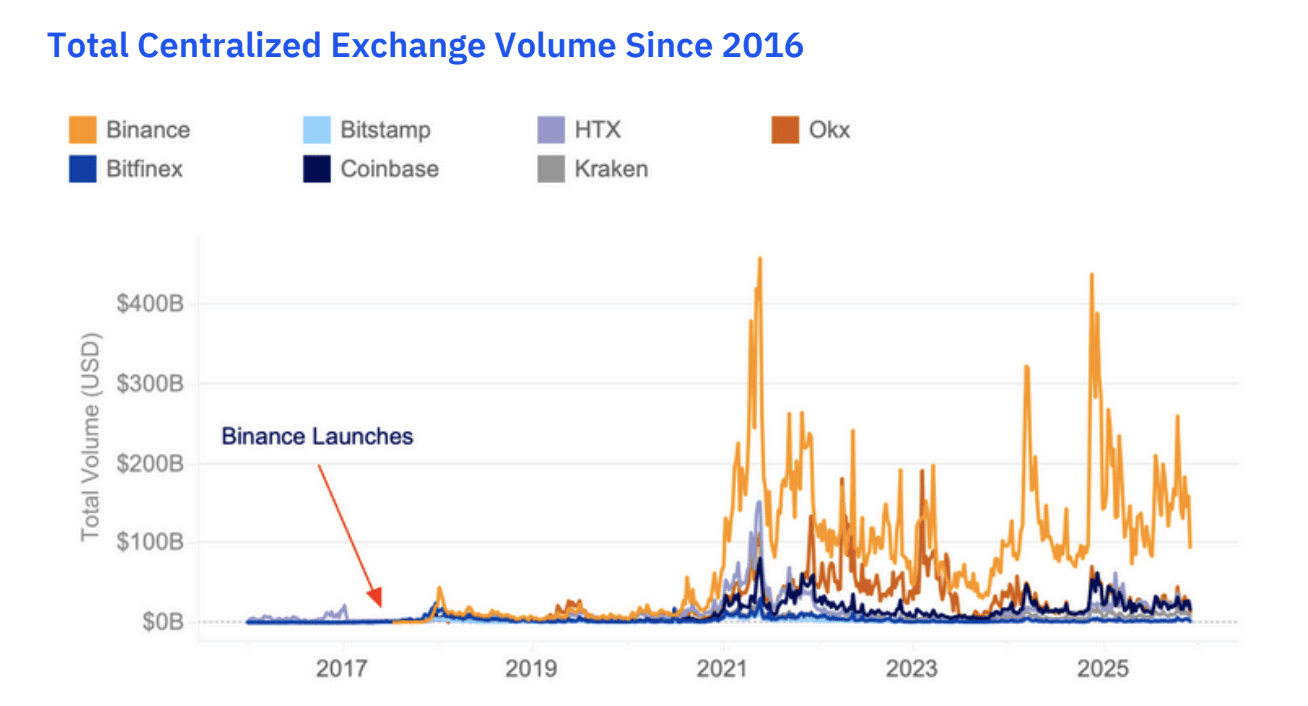 Binance’s share of global volume accelerated starting in 2019 and has remained dominant across cycles.