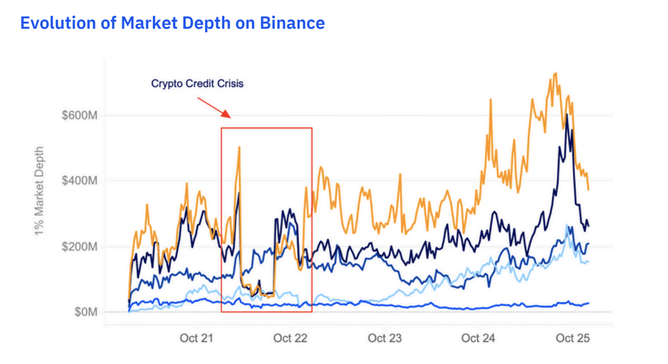 The charts show depth dipping during crises (e.g., Luna, FTX) but rebuilding to stronger levels afterward. By late 2025, the books were not merely restored, but materially thicker across multiple assets.