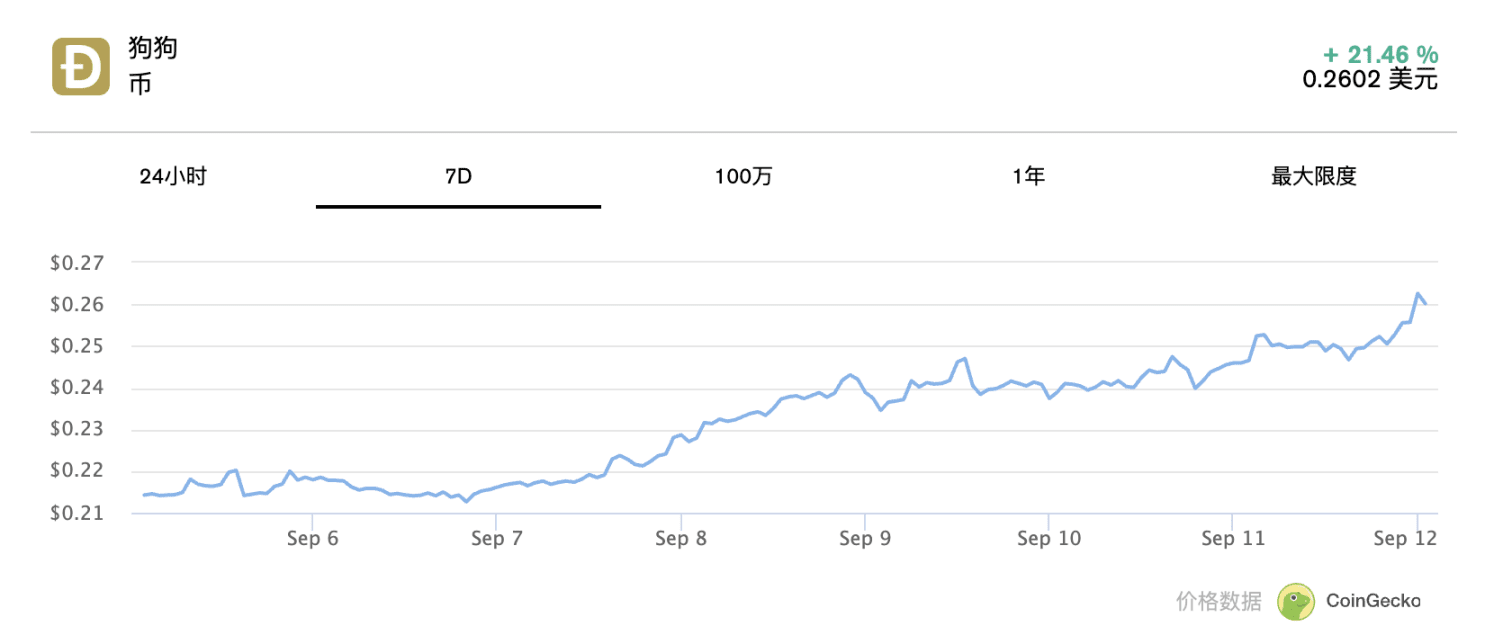 Dogecoin price surges 20% in a week, reaching $0.2543, its highest level since August 13.
