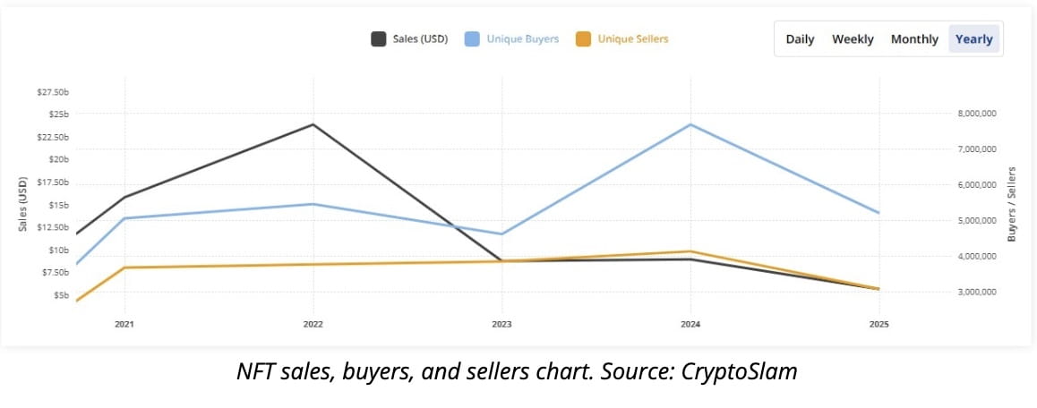 NFT sales totaled approximately $5.63 billion in 2025, representing a 37% decline from the $8.9 billion recorded last year, CryptoSlam data shows. Average sale prices also weakened, falling to $96, down from $124 in 2024.