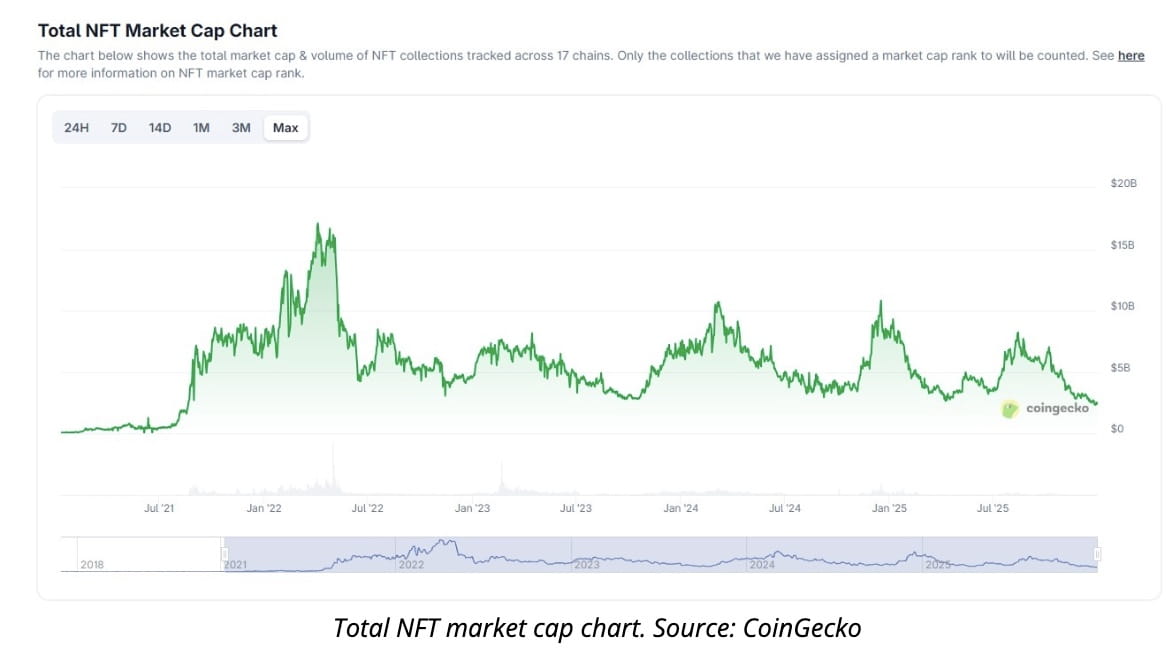 The broader NFT sector has continued to unwind excess from the previous cycle. Total market capitalization has steadily declined since peaking at around $17 billion in April 2022, reflecting a prolonged correction following the speculative boom.
