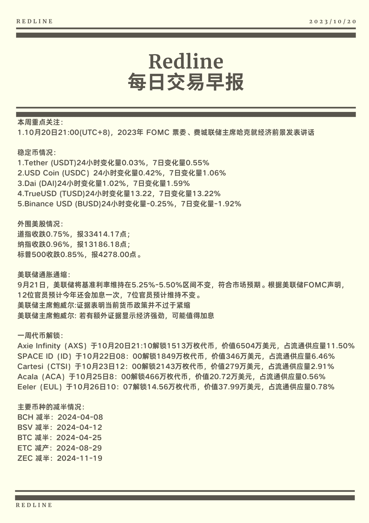 1. At 21:00 on October 20 (UTC+8), Harker, the 2023 FOMC voting committee member and President of the Federal Reserve Bank of Philadelphia, delivered a speech on the economic outlook.