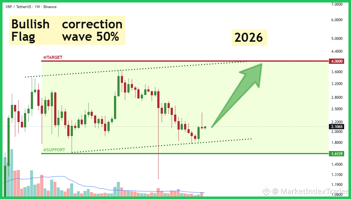The chart clearly shows $XRP consolidating within a classic Bullish Flag pattern after a powerful initial pump. We observed a crucial retest and bounce near the lower channel support zone at $1.61. As long as this flag structure holds, the path of least resistance is up. The immediate area of interest is the current price range ($2.1065). A successful breakout above the upper boundary signals acceleration toward the ultimate psychological and historical resistance target at $4.00.