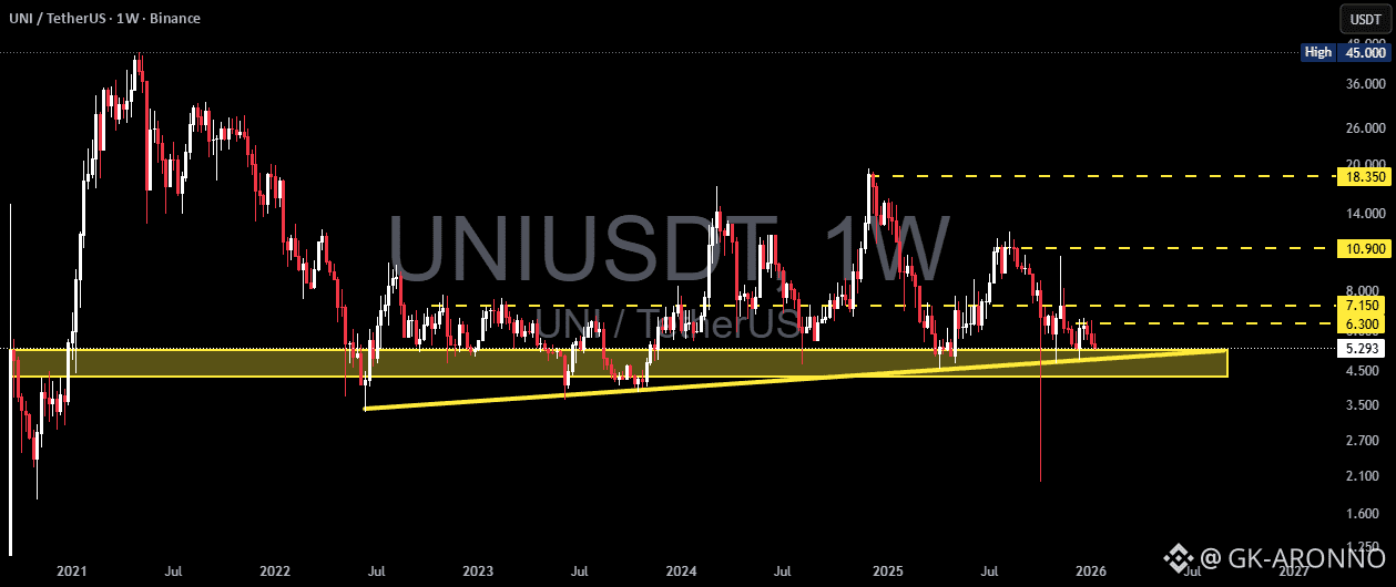 UNI/USDT is currently trading on the Weekly (1W) timeframe and remains within a broad range following a prolonged downtrend from its historical peak. Price has returned to test a key demand zone (yellow box 5.2 – 4.3), which has acted as a strong historical support since 2022.