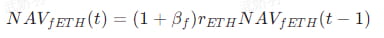 At the beginning of the protocol, the price of fETH was set to $1. The protocol controls the volatility of fETH by adjusting its NAV so that it only reflects 10% of the change in ETH price (i.e. β_f = 0.1). When the price of ETH changes, the NAV of fETH is updated according to the following formula: