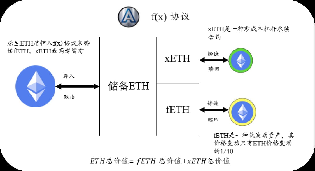 Simply put, the f(x) protocol allows users to use ETH to generate fETH and xETH, and then use these two tokens to enjoy different degrees of ETH price changes. The price of fETH will only follow 10% of the change in ETH price, which means it has a β coefficient of 0.1. The price of xETH will reflect the ETH price changes that fETH does not reflect, which means it has a β coefficient greater than 1. In this way, fETH is equivalent to a floating stablecoin, and xETH is equivalent to a leveraged long-term investment tool.