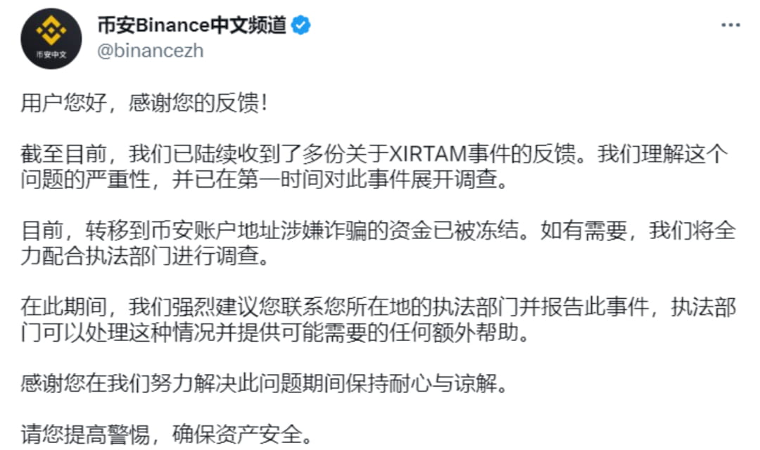 XIRTAM raised about 2,000 ETH in several rounds. Interestingly, the project owner who ran away later transferred the raised ETH to Binance. Currently, Binance has helped freeze the funds. The victims quickly found evidence of the lost funds and reported it to the police and submitted it to the customer service. This also shows that the project owner lacked experience in running away.