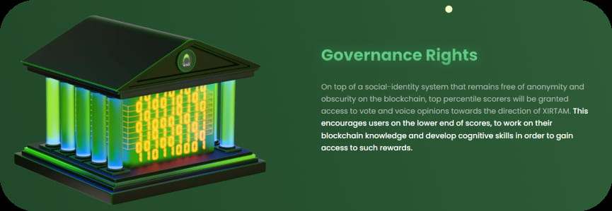 Those with the highest points will be granted voting rights and have a say in the direction of XIRTAM, in addition to maintaining anonymity and an ambiguous social identity system on the blockchain. Users with lower scores will be encouraged to work hard to learn blockchain knowledge and develop cognitive skills to receive such rewards.